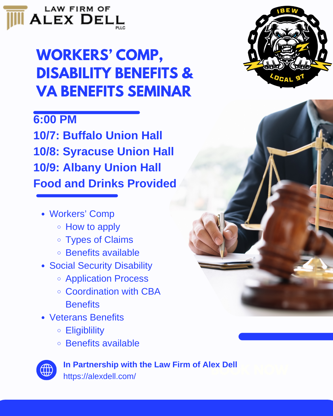 In partnership with the Law Firm of Alex Dell, we will be holding seminars at each of our union halls explaining the application processes, benefits available, and eligibility for Workers' Compensation benefits, Social Security Disability, and Veterans' Benefits.